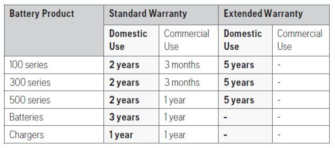 To extend the standard warranty of Battery products to a total of 5 years the battery product must be serviced annually by an authorised Husqvarna Servicing Dealer.